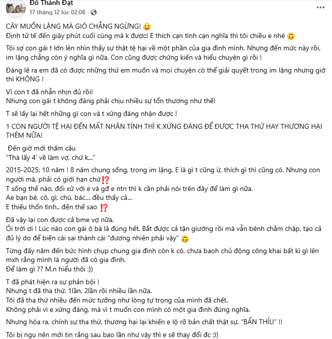 Bài update hôm nay anh chồng thú nhận rằng đã có lúc anh muốn xóa bài fot đó đi, vì vẫn còn thương vợ, vẫn còn tình nghĩa vợ chồng con cái, nhưng mà tự nhiên vợ lên trình báo công an nên thôi ứ thương nữa. Chấm hết tại đây
